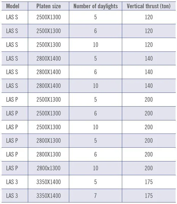 Sergiani热压机变得更具竞争力了。全新系列的sergiani gs手动压力机可提供单层至五层版本,垂直推力范围为20-200吨。sergiani gs和sergiani las电子控制压力机因其高精度和多用途性而成为层压板和镶板、空心门和多层板生产的最佳解决方案。