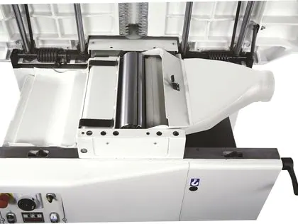 采用带4个刀片的95 mm直径刀头,因此可非常轻松地完成最佳刨削。为获得完美的精整效果,压刨机进给辊的压力可根据加工的木材类型进行调整。前进给辊带有螺旋齿,用以保证稳固、持续的工件进给,喷砂钢后进给辊则保持完美的后加工精整。