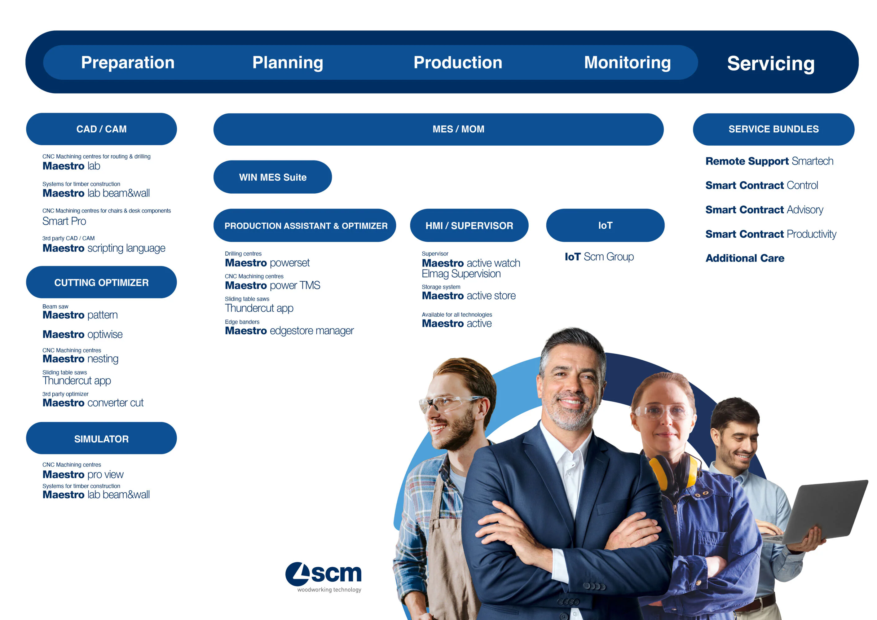SCM 数控机床控制软件可以与任何 MES 解决方案对接,支持客户进行生产的编程和计划。Maestro cnc数控加工中心系统 和 Maestro optiwise 数控软件可支持木材加工企业进行设计、优化和数据管理。 Maestro active 是先进的多点触控人机界面,可提供对生产的完整控制,易于与机床进行集成。Maestro connect 数字服务平台可监控机床状态,优化维护,管理问题,建议备件,智能学习,以及借助 Smartech 眼镜,提供增强现实技术援助。