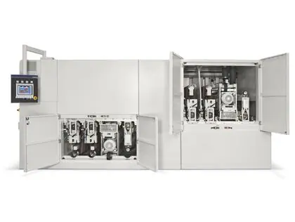 Top/bottom calibrating sanding line for large-sized companies in the woodworking industry characterised by high working feed speed rates and strong stock removals in heavy-duty production lines.