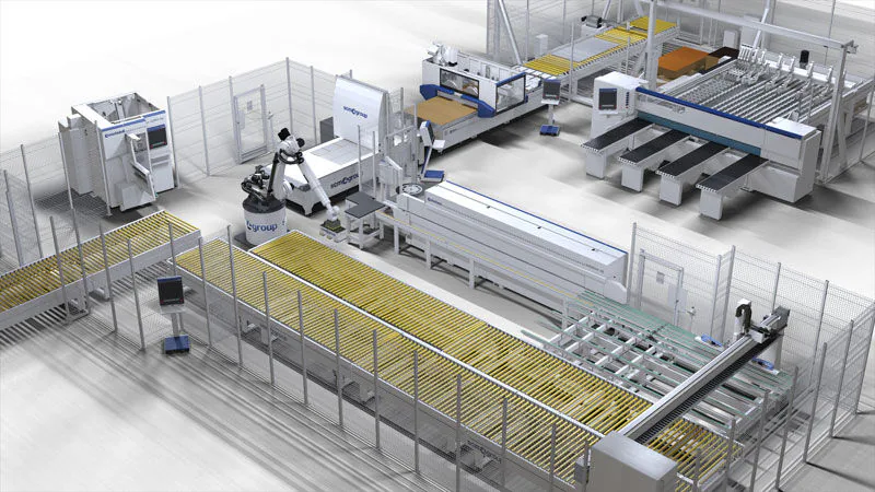 Выбран практический пример: система ячеек для производства элементов мебели. Производительность системы около 8-10 комплектов в смену. Речь идёт об автоматизированной системе, где контроль за всем процессом - от стандартной панели до готовой продукции - абсолютный.  Решение, имеющее низкую эксплуатационную стоимость, так как она управляется только одним оператором, требующее минимальных манипуляций, что устраняет опасность проявления дефектов, и характеризующееся т. н. "бережливым производством", не имеющим пауз, узких мест и внепланового обслуживания.