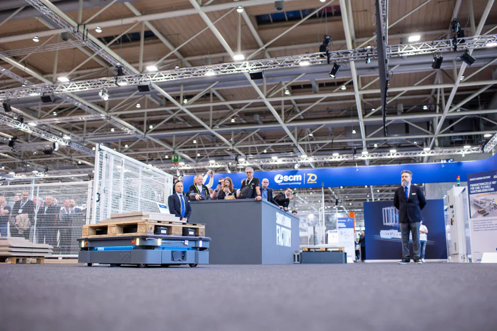 Все инновации имеют одну общую цель: сделать процессы более эффективными при снижении стоимости производства, потребления энергии и количества отходов в сочетании с упрощением менеджмента, как это отмечается на примере "Интеллектуальной, ориентированной на человека фабрики (Smart&Human Factory), представленной в двух различных версиях - для крупного производства и малого бизнеса.Система гибких ячеек, экспонируемая в Ганновере, способна производить до 400 мебельных компонентов в смену и в основном нацелена на производство мебели в разобранном виде. Это одна из многих конфигураций, которую способна принимать Интеллектуальная ориентированная на человека фабрика на основе запросов клиента. В ячейки интегрированы антропоморфные роботы и беспилотные транспортные тележки AMR.