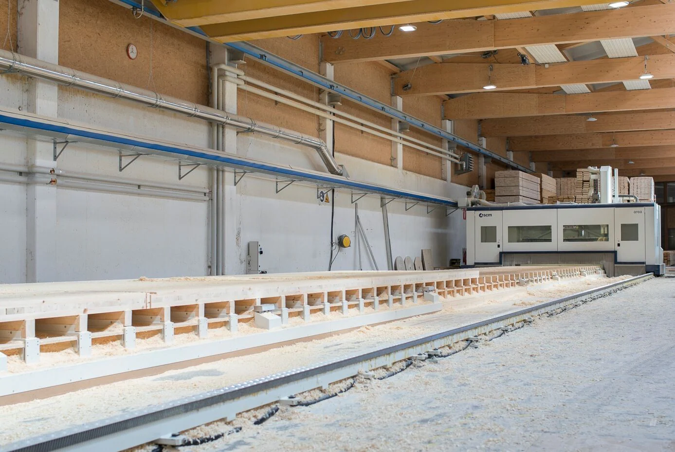 Um die Wahrheit zu sagen, haben wir bereits 1995 unser erstes Bearbeitungszentrum für den Schnitt und die Bearbeitung von Trägern gekauft. Diese Maschinen, die ich als bahnbrechend betrachte, haben sich in den nachfolgenden zwanzig Jahren weiterentwickelt und sind zu wertvollen Werkzeugen für unser Wachstum geworden. Dem Unternehmen SCM sind wir erst später, etwa 2015, begegnet, als wir zu einem Besuch des Standorts Sinalunga (Siena) eingeladen wurden: Wir sahen Maschinen, die uns sofort gefielen, insbesondere eine „oikos“ mit einem sehr robusten Aufbau, die mit einer Logik arbeitete, die mich sofort faszinierte. Innerhalb kurzer Zeit beschlossen wir, sie für die Bearbeitung der Träger zu kaufen, während wir die „BSP/X-lam“-Platten weiterhin auf „unserer“ Maschine bearbeiteten, die wir viele Jahre zuvor - wenn ich mich recht erinnere, im Jahr 2008 - in Zusammenarbeit mit verschiedenen Zulieferern mit Software, Schienen, Säge und einem Roboter zusammengebaut hatten! Diese funktionierte damals noch und läuft bis heute. Aber angesichts der Effizienz der „oikos“ und der umfangreichen Verbesserung und Erhöhung unserer Produktion durch den Einsatz dieser Technologie von SCM wurde uns klar, dass wir etwas anderes und leistungsfähigeres brauchten.