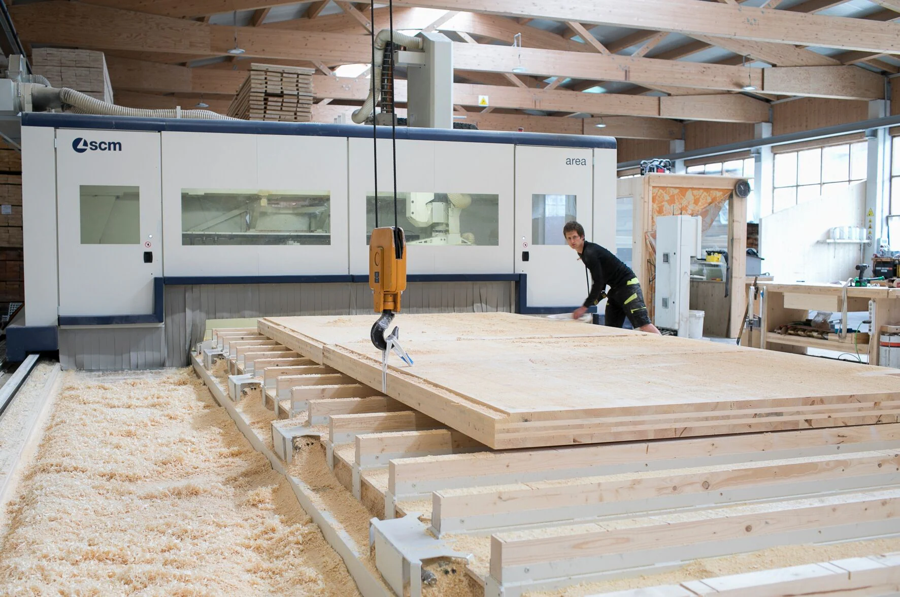 Ein schönes Land... von Novacella in Richtung Toblach, bis nach einigen Kilometern hinter Bruneck die Gemeinde Welsberg-Taisten erreicht ist und die Hinweisschilder ins Gsieser Tal führen. Ein paar Kurven weiter wird klar, dass man auf dem richtigen Wege ist: Das große Schild der Moser Holzbau, ein stilisiertes Haus mit einer großen gelben Sonne, verrät uns, dass wir angekommen sind: Wir treffen uns mit Georg Moser, der gemeinsam mit seinem Bruder Alois das Unternehmen leitet. Seit 2019 tut hier eine leistungsstarke „area“ aus dem Hause SCM ihren Dienst.