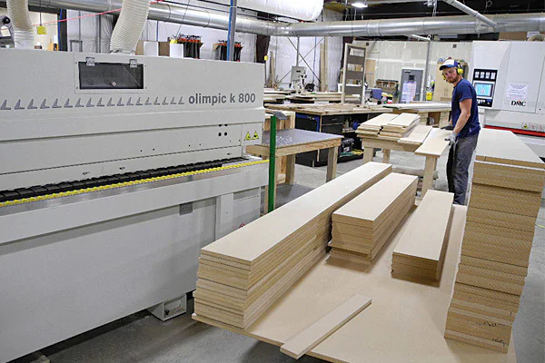 A Morbidelli Author M800, Olimpic k800 edgebander, and DMC Eurosand L widebelt sander are some of the most relied upon machines in the shop. The Morbidelli was purchased for its large-scale capabilities. The table is 16 x 6 feet, so they can service large live-edge slabs. The five-axis router has many capabilities, and is used in many applications. “Most five axis routing is positional five-axis routing,” Wolfe said. “We’re machining the edge of the board. We’re doing operations in that five-axis position, versus true five-axis routing where you’re changing three axes at once. We have that capability and can machine three-dimensional parts, but from our end, at this point it’s being primarily used for five-axis positional routing.” Wolfe dealt with the question of whether to have a pod-and-rail or nested-based router by having both. He designed a modification so that the Morbidelli can fulfill both roles.