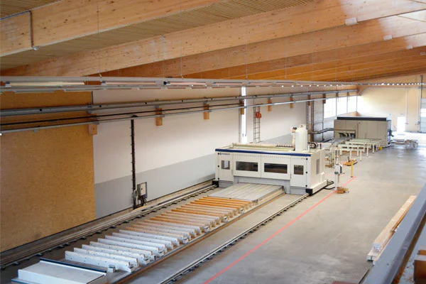Eine Maschine, mit der alles möglich ist, vom Nesting an den Wänden eines Fertighauses über die Bearbeitungen mit fünf Achsen auf sechs Seiten eines Balkens, so dass keine weiteren Eingriff e mehr auf der Baustelle notwendig sind.