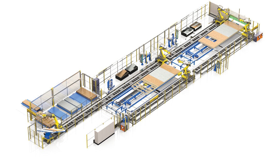 ROBOTIC SYSTEM FOR HIGH EFFICIENCY PRODUCTION OF WALL AND FLOOR ELEMENTS. CONFIGURABLE. CAD SUPPORTED.
