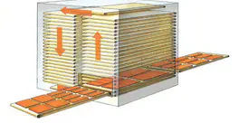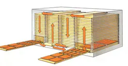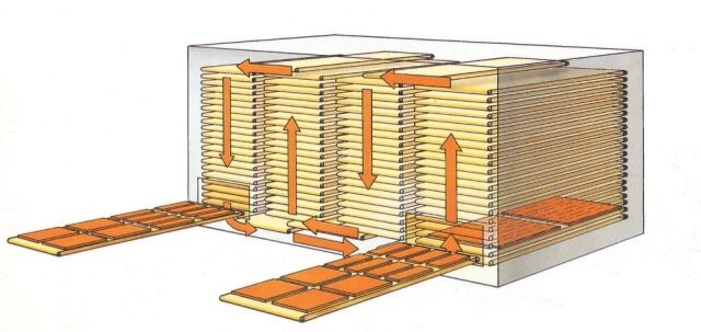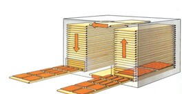 Vertical dryer with belt trays, used where it is necessary to achieve a hot air drying with quite long drying times (from 15 min. to some hours), typically therefore in case of automatic finishing lines with spraying or curtain coating applications.