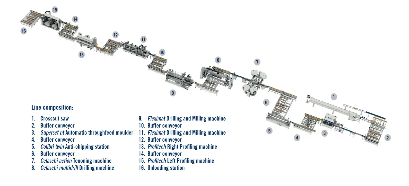 As with all the SCM “systems”, the integration of multiple machines enables to perform all the operations for producing windows frame: planing with the “superset nt” throughfeed moulder, tenoning with the new “celaschi action”, drilling and routing with the “fleximat” machining centre and profiling on both right and left sides with two “profitech” machines. The new “celaschi action” double-sided tenoning machine, the beating heart of the “system 9” line, allows simultaneous tenoning of two elements of different lengths, widths and thicknesses, exploiting the principle of machining with the motors moving when the pieces are stationary. Among the plus points is a high degree of flexibility in the production of tenons, thanks to the presence of 4 electrospindles, each of which is served by a 6-position tool changer. It is thus possible to produce from 30 to 48 different tenons without any intervention by the operator.