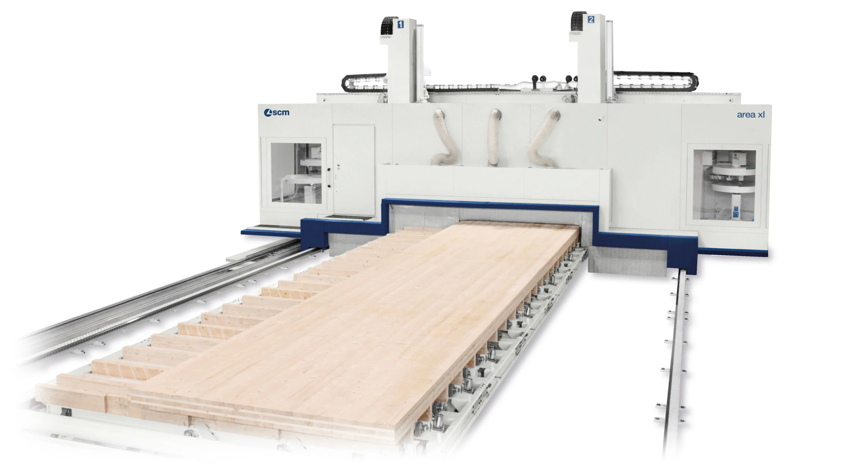 Tres centros de mecanizado cnc de 5 ejes especializados en la mecanización de paneles en CLT y vigas laminadas curvas. AREA, AREA X y AREA XL se caracterizan por una estructura a portal móvil protegida por una cabina integral y una composición modular que garantiza una alta eficiencia en le producción de elementos de gran formato, que se encuentran incluso en edificios públicos y grandes estructuras como instalaciones deportivas y puentes.