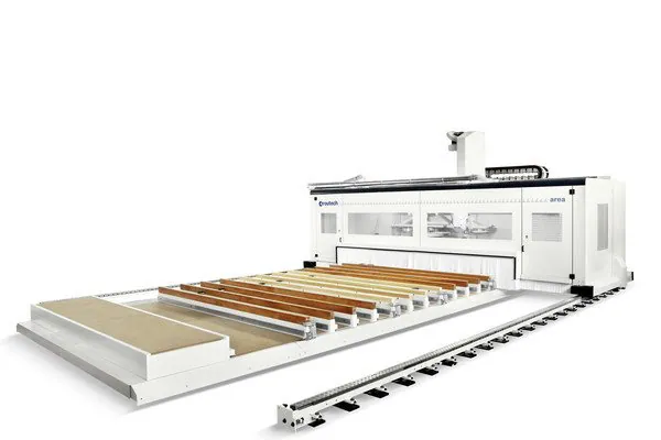 Area est, quant à lui, l'innovant centre d'usinage à CN à structure à pont mobile et composition modulaire pour l'usinage de parois structurelles en bois. Il permet d'avoir un plan de travail qui peut atteindre 4,5 m de large et 50 m de long. Il offre: