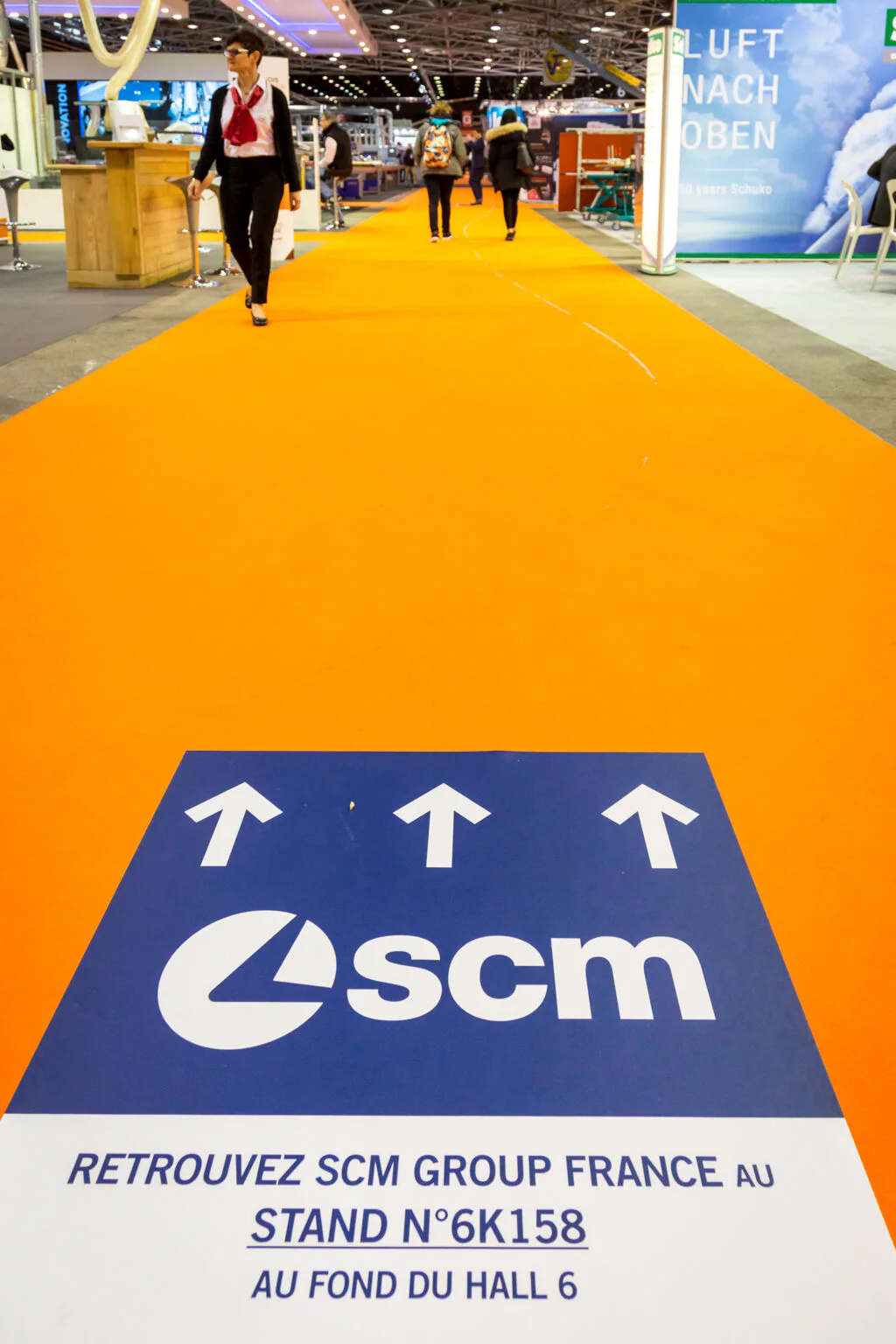 Un espace aux couleurs du concept « Les technologies pour l’usinage du bois constituent notre ADN » qui caractérise la communication de SCM depuis mai 2017, date qui a vu le regroupement sous la seule et même marque SCM de l’ensemble de la gamme de machines pour l’usinage du bois.