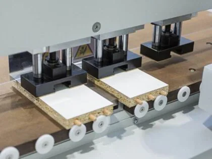 Le HBD 1300 1H est une machine CNC à châssis ouvert pour percer, coller et insérer des goujons avec un champ de travail de 1300 mm (51"). Les barrières centrales et latérales sont rétractables afin de traiter une pièce de jusqu'à 8 pieds de longueur en deux cycles. Avec le système de revolver "Sure Shot" d'OMAL, le temps de cycle de perçage, collage et insertion de goujon est d'environ UNE seconde lorsque les trous sont espacés de 32mm. Le système de revolver OMAL garantit que de la colle et un goujon sont insérés à chaque fois!