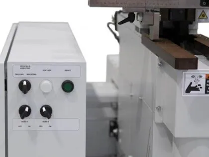 Panneau de contrôle : Contrôle indépendant de la tête pour activer/désactiver le cycle de perçage ou d'insertion. Équipé d'un capteur inductif pour garantir qu'aucune charnière n'est présente avant le cycle de perçage.