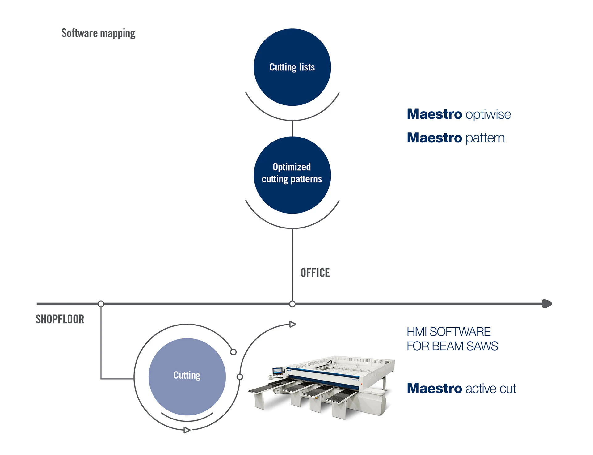 SCM beam saws are always provided with Maestro pattern office, the standard entry-level optimization software. In addition, with Maestro optiwise we offer our customers user-friendly scalable software for optimizing the cutting of the materials shaped from the panel.