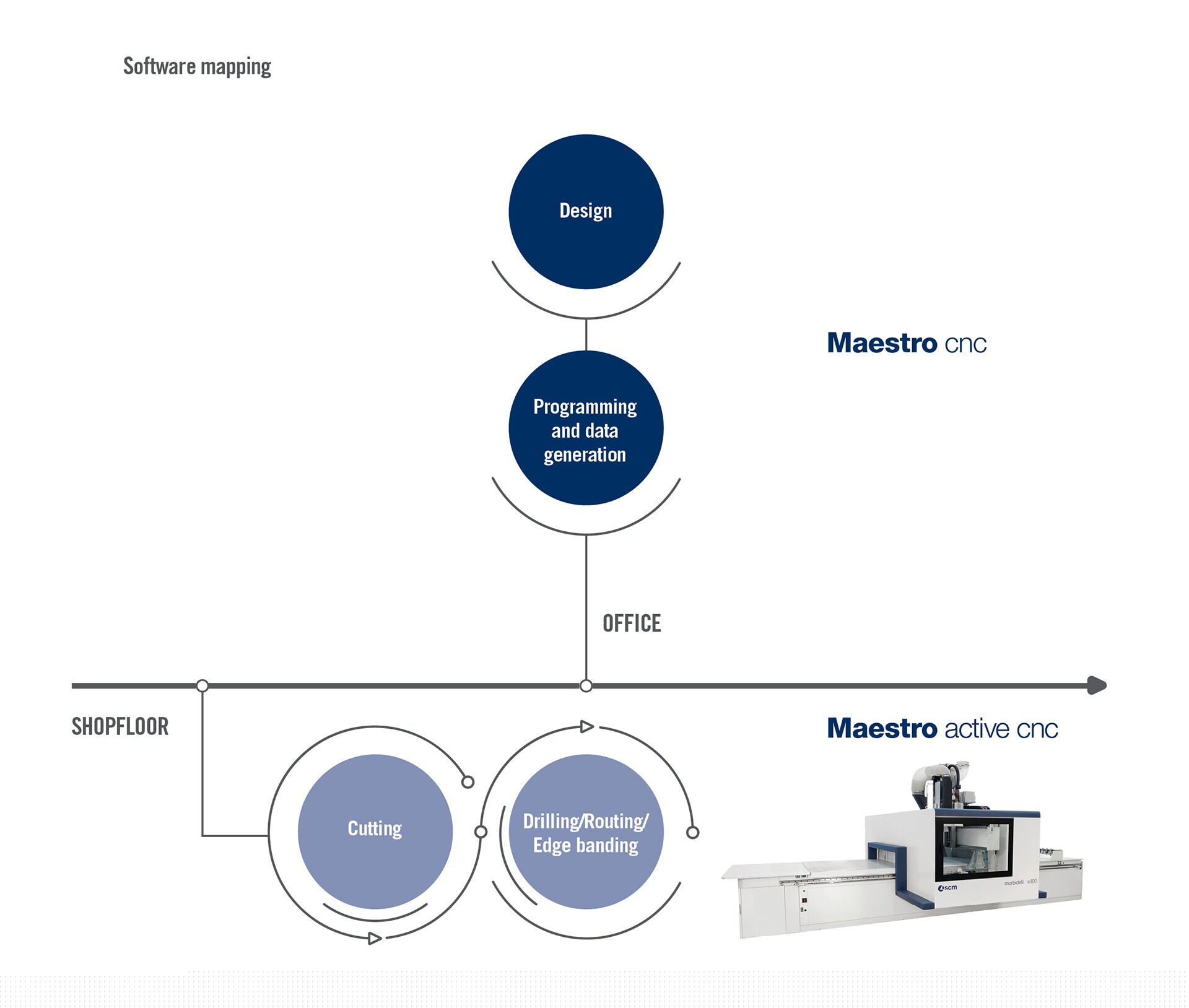 Maestro cnc. In the office, before the production, the design and programming system Maestro cnc ensures that all the wood workings are quickly and easily programmed thanks to smart functions (app and macros libraries) built to program any machine operation with a mouse click. Another click away and cnc programs are automatically generated.