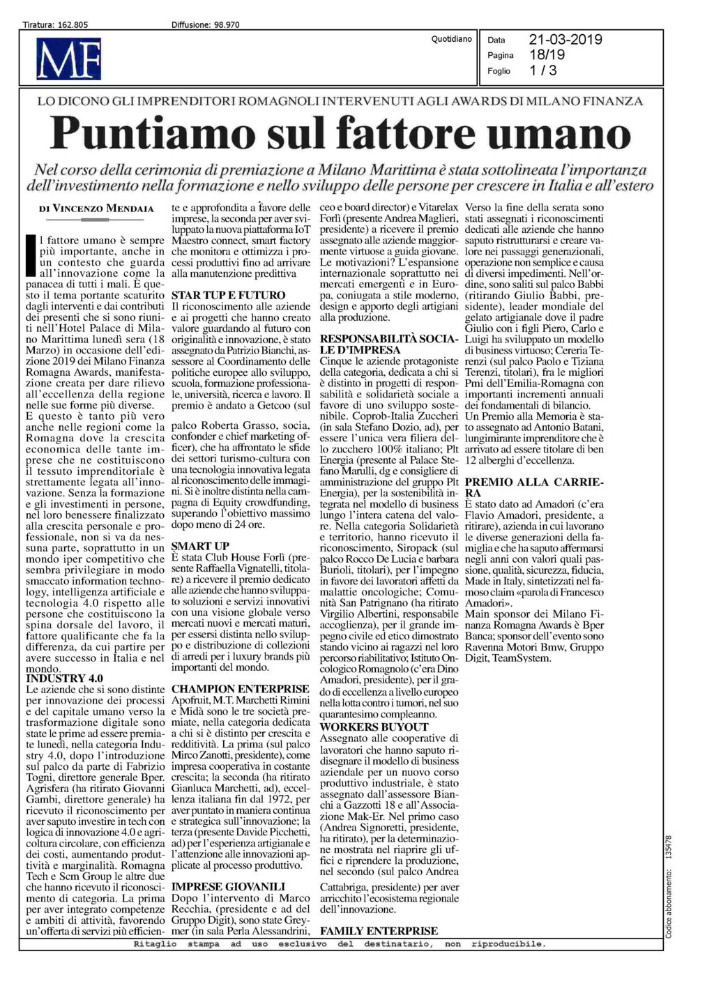 Scm Group è tra le eccellenze emiliano-romagnole premiate da Milano Finanza alla prima edizione dei Romagna Awards. Al nostro gruppo è andato il Premio “Industria 4.0”, importante riconoscimento agli investimenti effettuati nelle tecnologie IoT per supportare il cliente monitorando e ottimizzando i processi produttivi fino ad arrivare ad una manutenzione sempre più intelligente e produttiva. A ritirare il Premio, il Presidente di Scm Group Giovanni Gemmani che ha sottolineato la capacità del gruppo di innovare per continuare ad essere leader mondiale e dare una risposta sempre più performante alle nuove sfide tecnologiche del settore.