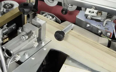 -wstępne frezy przygotowują krawędź płyty do klejenia, redukując nierówności po podcinaczu i zmniejszają zużycie kleju. Okleiniarka standardowo wyposażona w diamentowe frezy o średnicy 80mm H=56mm,pozawalające zebrać do 2mm materiału.
