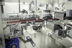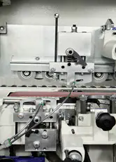 K100 ze wstępnym frezowaniem płyty na dwóch frezach i dwoma miejscami na agregaty czyszczące (cyklina płaska i profilowa) daje perfekcyjne wyniki obróbki „na gotowo”.Okleja elementy o grubości od 8 do 50mm, z prędkością posuwu 7m/min, okleiny z tworzyw sztucznych i naturalne od grubości obrzeża 0,4mm do 3mm,a doklejkę drewnianą do 5mm.