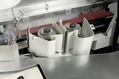 - Nieprzypadkowo zespół dociskowy jest wyposażony w dwie stalowe rolki. Ich zadaniem jest odbiór ciepła z obrabianej krawędzi, każda rolka jest zamocowana na oddzielnej sprężynie dla lepszego dopasowania względem grubości obrzeża.