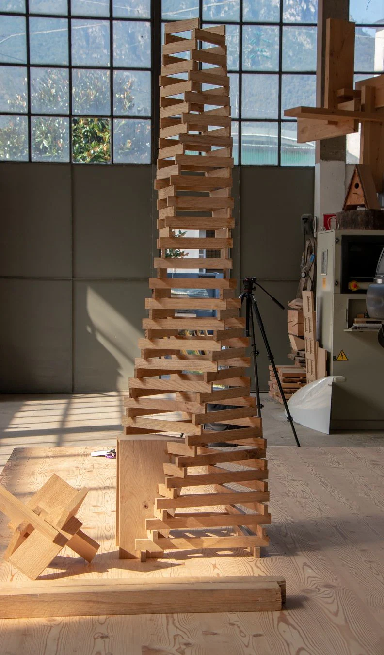 With these large timbers, important installations are made, structures created on behalf of great architects and artists, for which Marco often carries out not only the prototype, but also all the structural calculations and the various tests of load and resistance, as well as the follow up of the on-site installation of the final work.