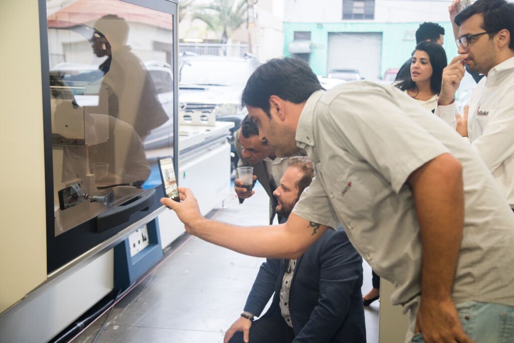 Ainda exibindo soluções em corte, colagem de bordos, furação e usinagem. Além, é claro, dos diferenciais quando o assunto é comunicação entre as máquinas e o mundo digital.