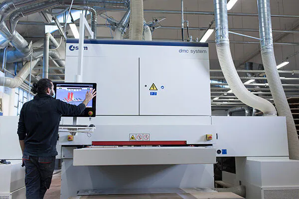 Die Schleifmaschine „dmc system” ist die neueste Anschaffung aus dem Hause SCM. „Eine extrem wichtige Maschine für uns, da wir den Schliff sowohl von rohen wie lackierten Platten qualifizieren und verbessern können“, erläutert Caslini. „Da es sich um eine äußerst leistungsfähige Lösung handelt, die aus verschiedenen Arbeitsaggregaten besteht, können wir auch leicht gewölbte Möbeltüren und Möbel mit Intarsien-Arbeiten bearbeiten und schleifen, ohne die Plattenoberfläche zu beschädigen.”