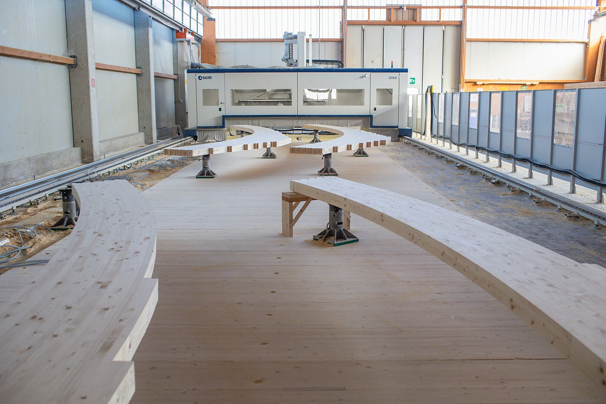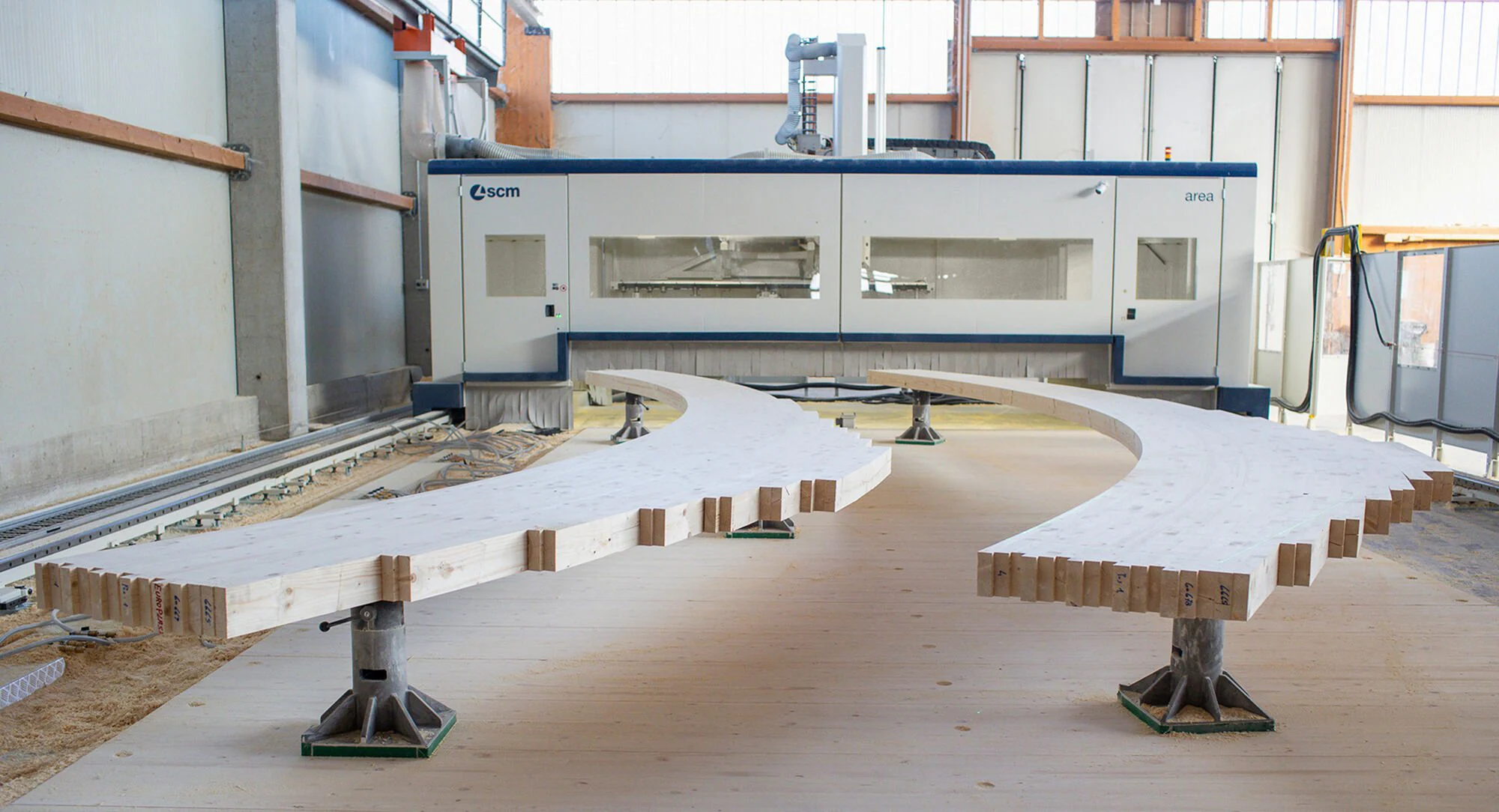 Holzbau Sud ist auf den Holzbau spezialisiert und kennt sich besonders gut mit der Bearbeitung von gebogenen Trägern aus, die dank der Anschaffung der 5-Achsen-Abbundanlage SCM AREA in der Montage- und Installationsphase einfacher geworden ist.