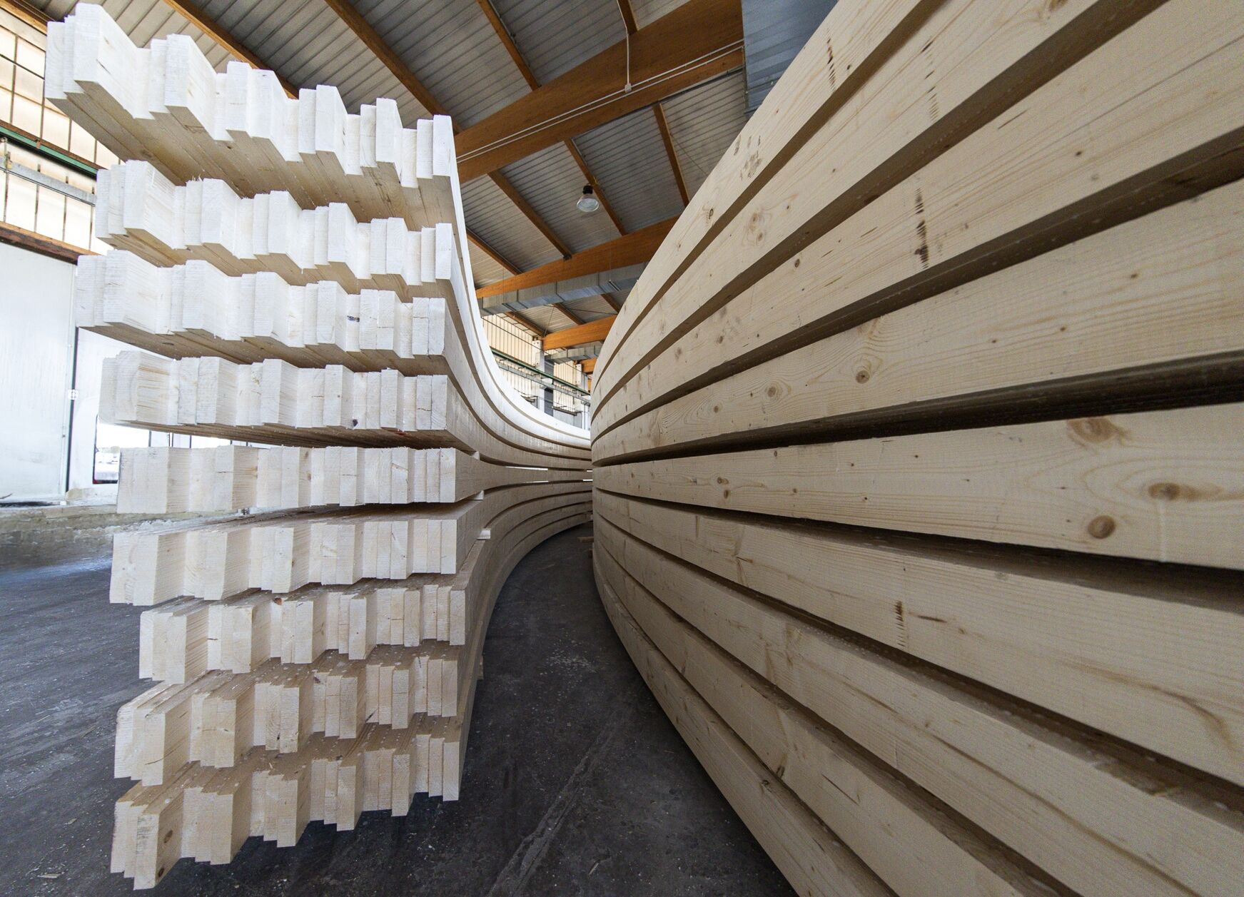 "Holzbau Sud verwendet als Rohmaterial unbehandelte Holzbretter in verschiedenen Größen und Stärken aus Österreich. Mit Hilfe des Holzproduktions- und Engineering-Verfahrens werden die Bohlen zu geraden und gebogenen Trägern verarbeitet, die dem von der technischen Abteilung erstellten Entwurf entsprechen. Wir sind einer der wichtigsten Hersteller von gebogenen Strukturen für große Gebäude wie Turnhallen, Schwimmbäder, Einkaufszentren, Tennis- und Padelplätze sowie seit kurzem auch für den Wohnungsbau. Bei den Leimbindern und CLT-Wänden gibt es zwei unterschiedliche Bearbeitungsverfahren.