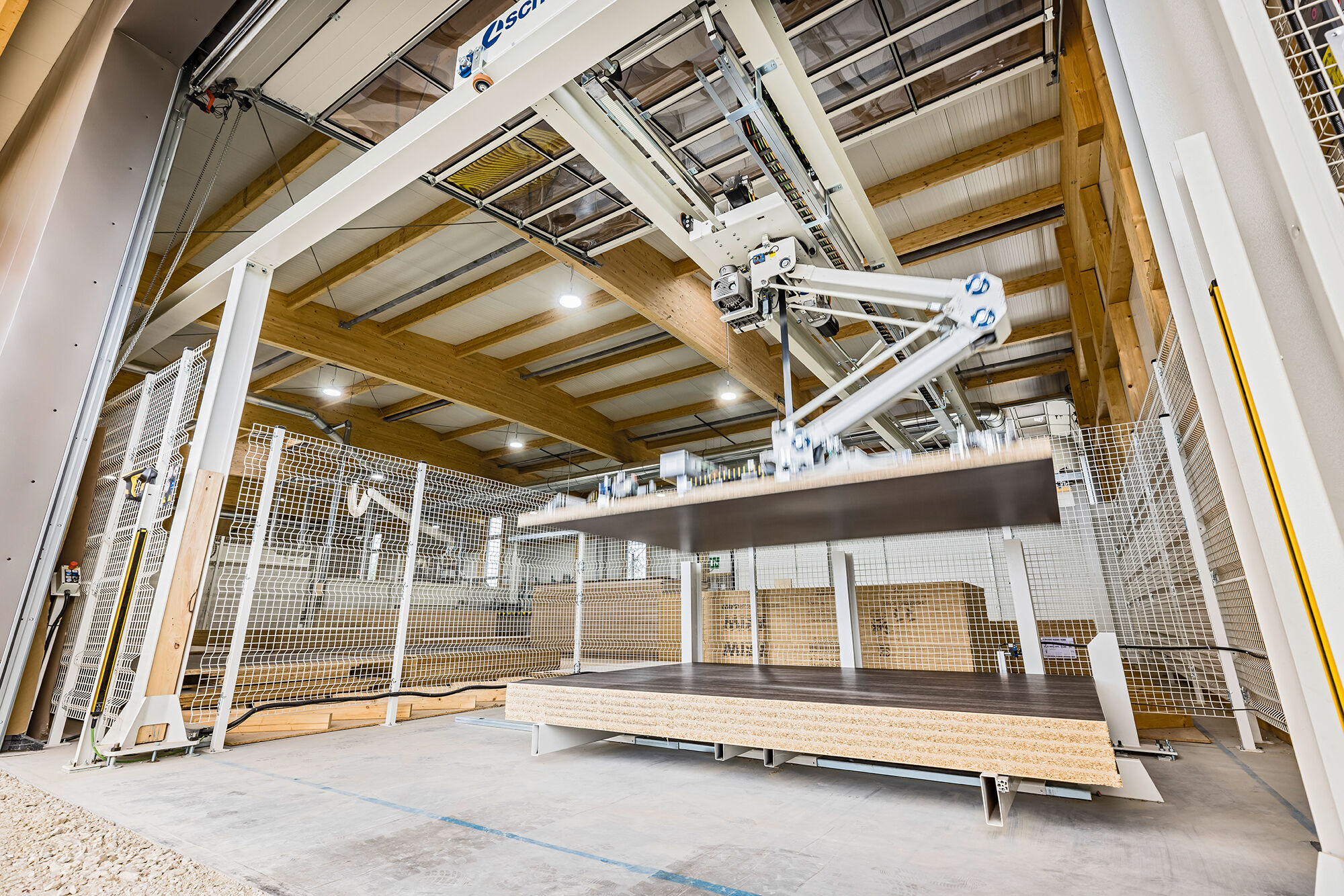Neben den herkömmlichen Maschinen, die in Schreinereien üblich sind, fallen in der neuen Produktionshalle von Bäumle sofort einige High-Tech-Maschinen auf. Darunter ist die Lösung, die Bäumle den ersten großen Schritt in Richtung Automatisierung erlaubte: eine Zelle für Nesting-Bearbeitungen, die er von der italienischen SCM-Group erworben hat.