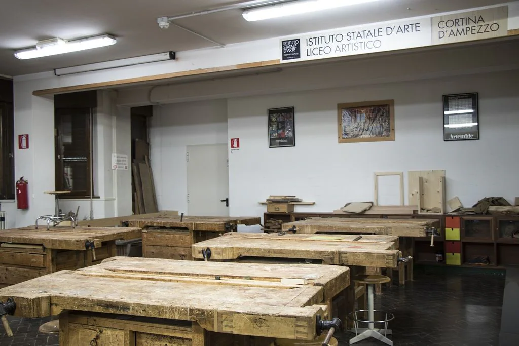 Leaving the area dedicated to tools and manual work, we enter the huge carpentry of the school, fully equipped with SCM machines, perfectly protected according to safety standards and therefore suitable for use by inexperienced users as the youngest cadets of the State Institute of Art of Cortina d'Ampezzo.