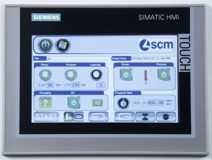Presse zur ständigen Herstellung von Tischlerplatten mit automatischer Be- und Entladung und Zusammensetzung. Es stehen mehrere Lösungen zur Verfügung um die kantenverleimten Platten zu beladen und die Möglichkeit, pneumatische Anschläge hinzuzufügen um mehrreihige Platten zu bilden.