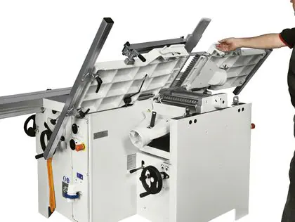 Thicknessing is more comfortable: during the changeover from surfacing to thicknessing the surfacing tables open towards the inside of the machine, with a 90° angle, and simultaneously. Work pieces with a maximum height of 230 mm can be machined to the thicknesser. The new design of the dust conveyor, protecting the cutter block, is specifically intended to further increase system safety and efficiency.