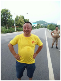 在上午11:10分,隊伍走到全程的中間段16公裡處的新中鎮場口時,全隊稍作休息,多數同事在32度的高溫下,衣服已經被汗水濕透了,葉總和公司重量級的胡江最先到達。