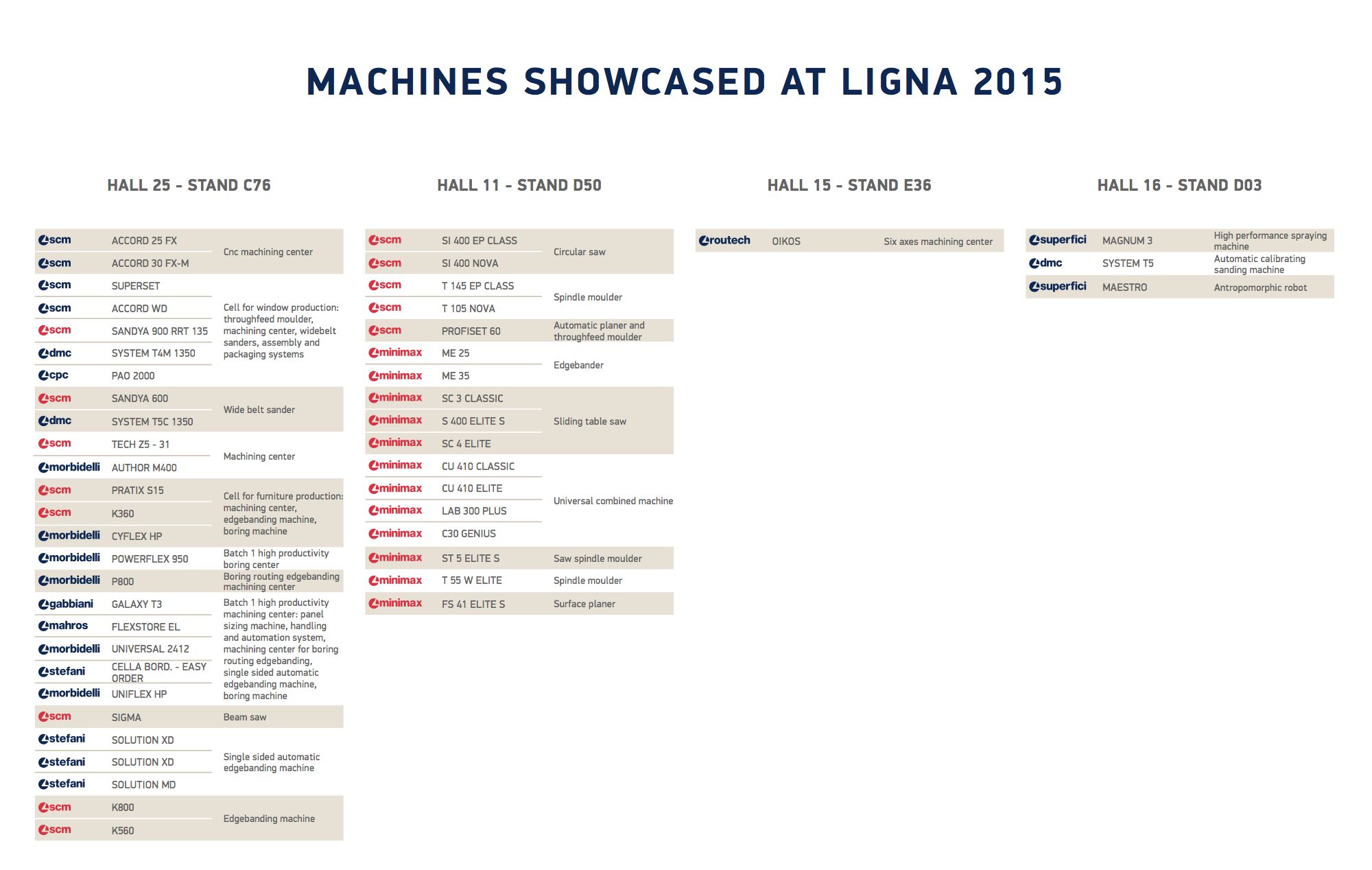- Hall 11: a dedicated area specifically for joineries,with a wide range of classical machinery from the standard size up to the new and prestigious L'Invincibile.