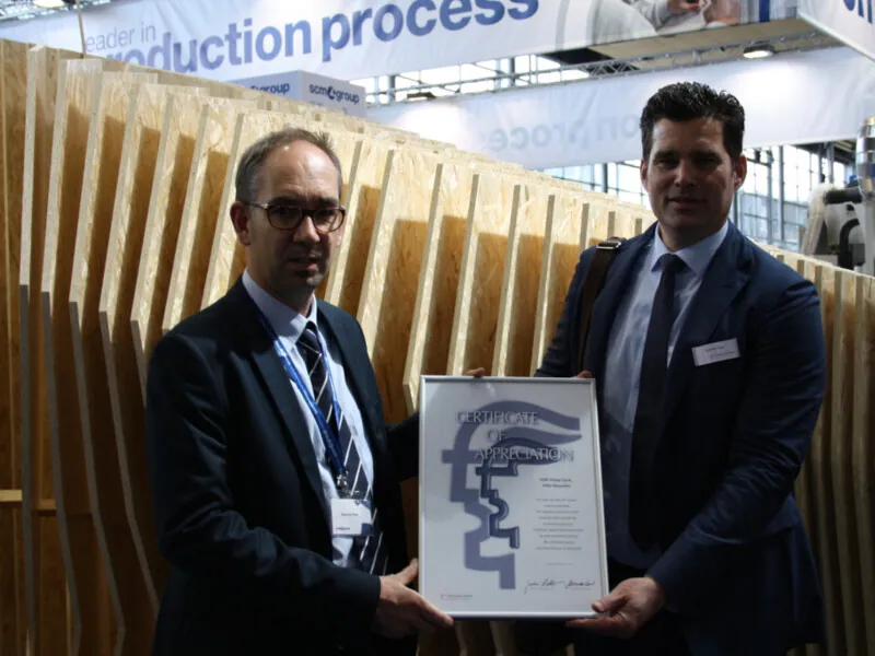 Superfici, the Scm Group brand specialised in finishing technologies, has taken part at Ligna for 20 editions.  Andreas Zuge of the Deutsche Messe presented and official certificate to Gloria Valtorta and Raphaël Prati as acknowledgement and appreciation to Scm Group’s commitment to Ligna.