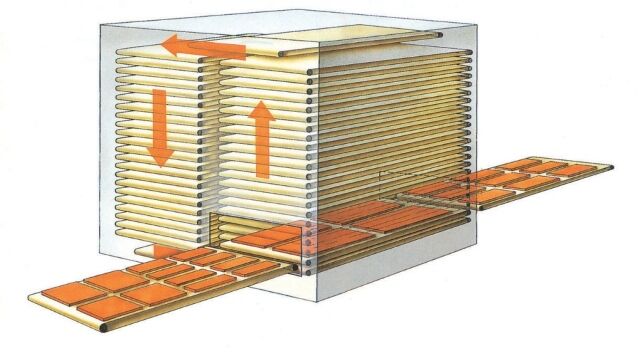 Vertical dryer with belt trays, used where it is necessary to achieve a hot air drying with quite long drying times (from 15 min. to some hours), typically therefore in case of automatic finishing lines with spraying or curtain coating applications.