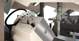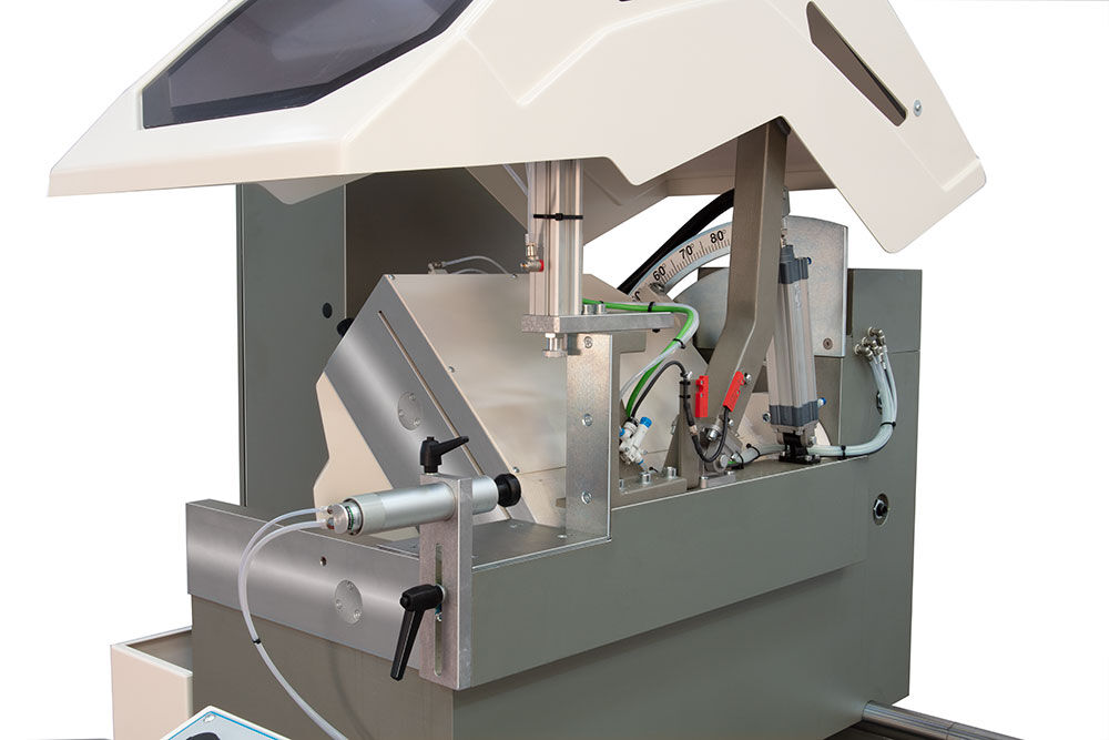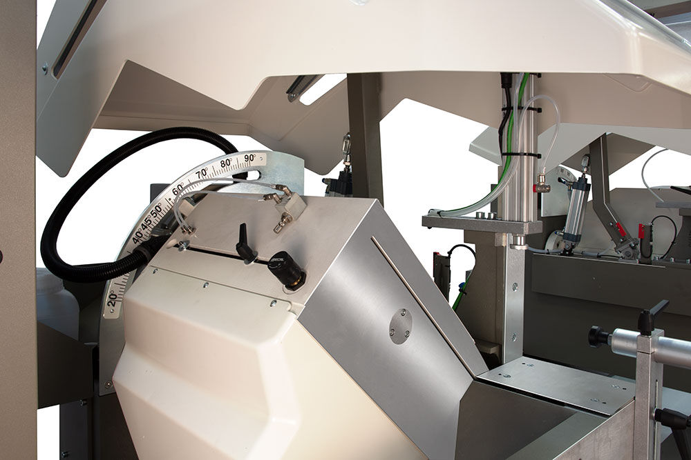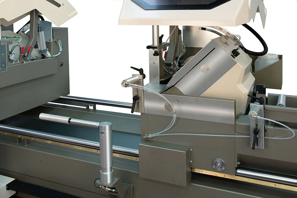 Double mitre saw with a fixed unit on the left and the other one movable.
