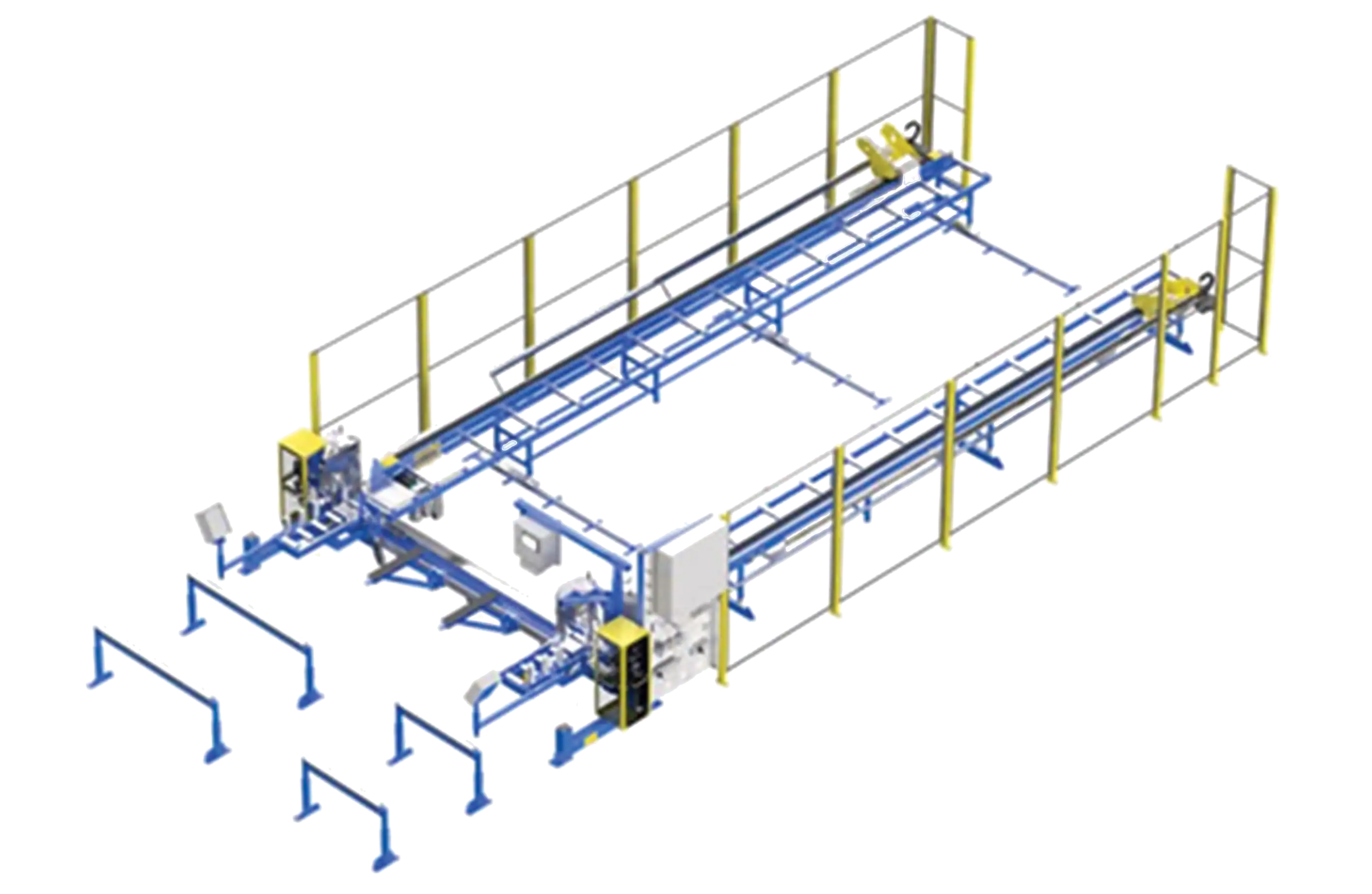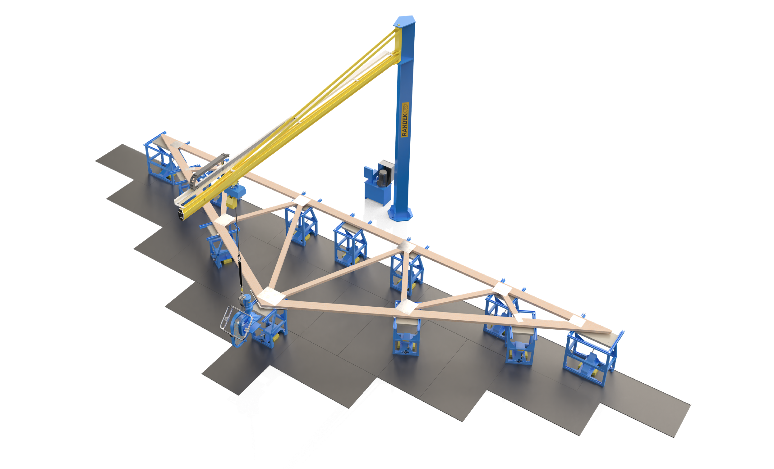 Equipped with an overhead laser system, the NT offers the capability to produce a wide range of roof trusses up to 40'-0" spans  (in its standard form). The NT is compatible with almost all truss designing software on the market. It is targeted to builders or framers looking to produce their own roof trusses offsite without having to outsource.