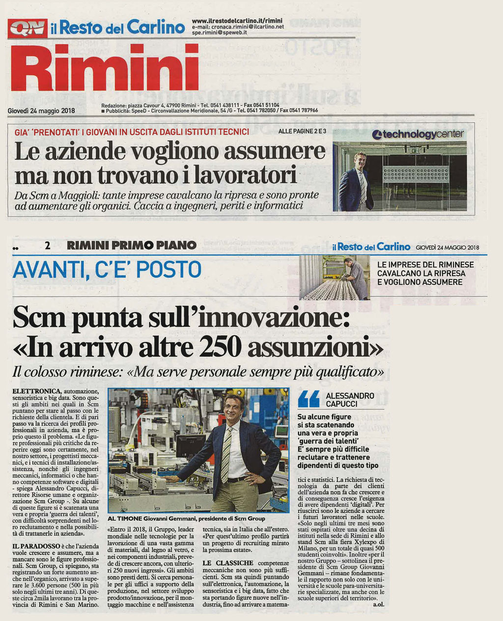Condividiamo il servizio con le interviste al presidente di Scm Group Giovanni Gemmani e al Direttore Risorse Umane e Organizzazione Alessandro Capucci, pubblicato sul Resto del Carlino giovedì 24 Maggio 2018, con un focus sulle importanti opportunità occupazionali offerte oggi dal Gruppo.