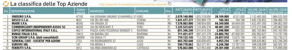 Scm Group nella top ten di "Top Aziende". L’edizione del 30 gennaio del supplemento del quotidiano Il Resto del Carlino, che ogni anno pubblica i bilanci delle principali aziende di Emilia Romagna e Marche, posiziona Scm Group al settimo posto della classifica sui fatturati 2019 delle aziende della Romagna. Nella tabella allegata, i dati consolidati di Scm Group, che nell’anno in questione ha registrato un fatturato complessivo superiore ai 700 milioni di euro. Un risultato che è frutto di scelte lungimiranti, di investimenti mirati e di una visione strategica.