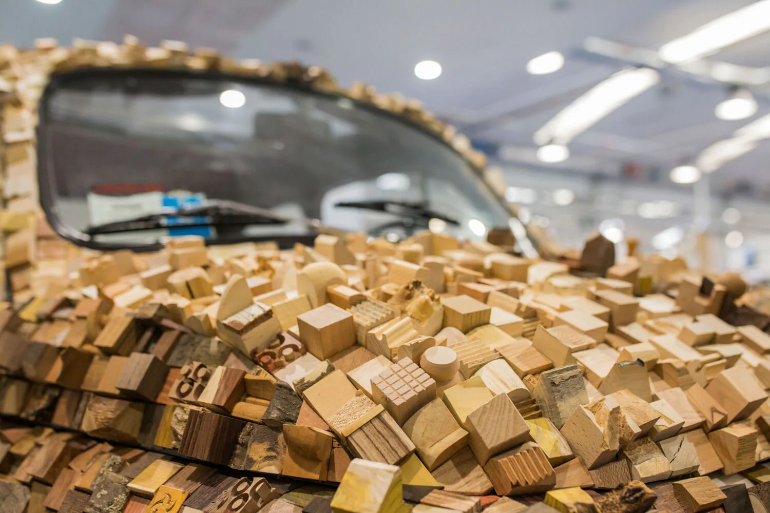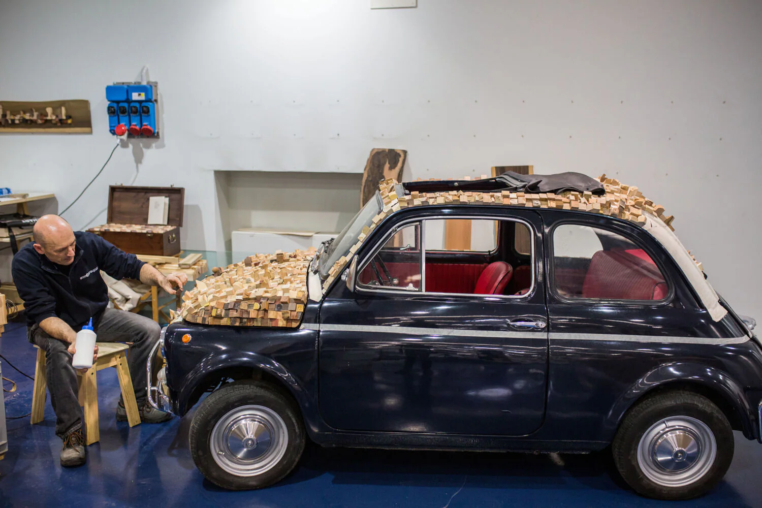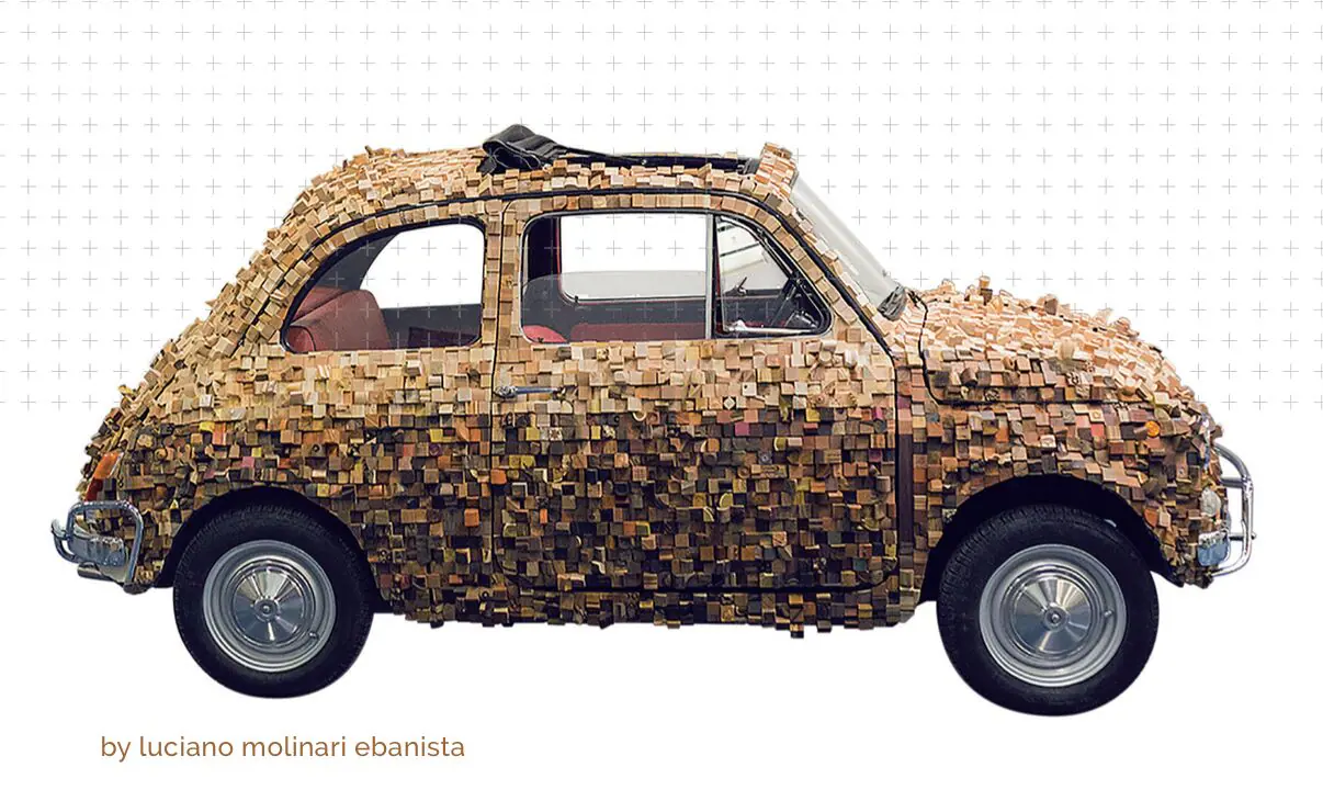 Cerejeira bocote maggiociondolo sucupira putumujù angelim rajado. These are the names of just some of the over 200 types of wood that Luciano Molinari - craftsman and artist - has processed on Minimax and Scm machines for his “500 kube” artwork, a 1969 Fiat 500 L completely covered with blocks of wood.