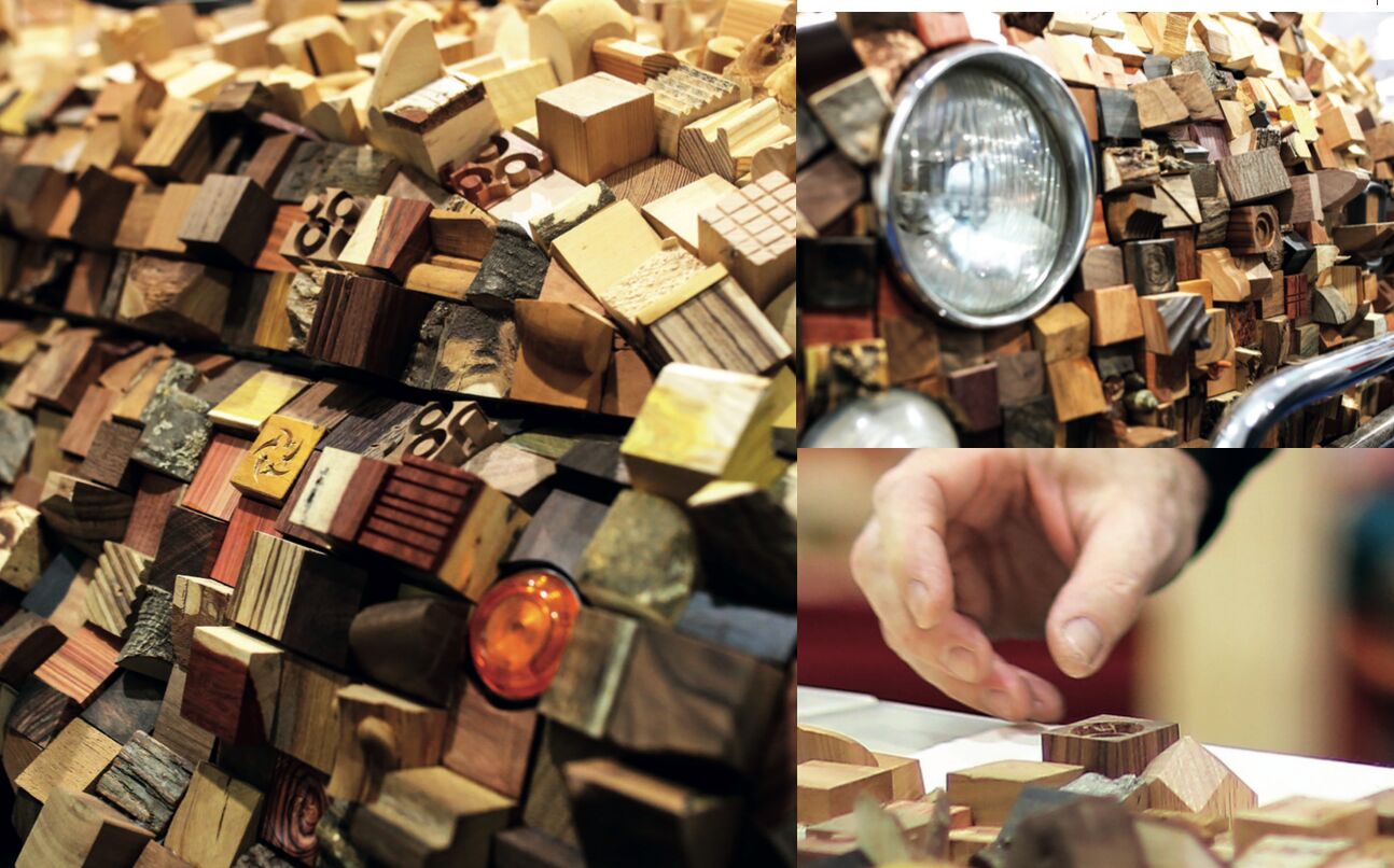 Molinari has transformed his genuine pas- sion for wood into an expressive art form and the common motif is the idea of giving new life and meaning to certain icons of “Italian Style”, milestones of that unique Italian ability to merge product and imagi- nation, dream and object. These works are dedicated to Aldo Rossi’s “Cupola” coffee maker, as is the covering – again made from a few thousand blocks of different types of wood – of a 1963 Vespa 50, another icon of Italian design, that now greets visitors at the Scm Group showroom in Rimini.