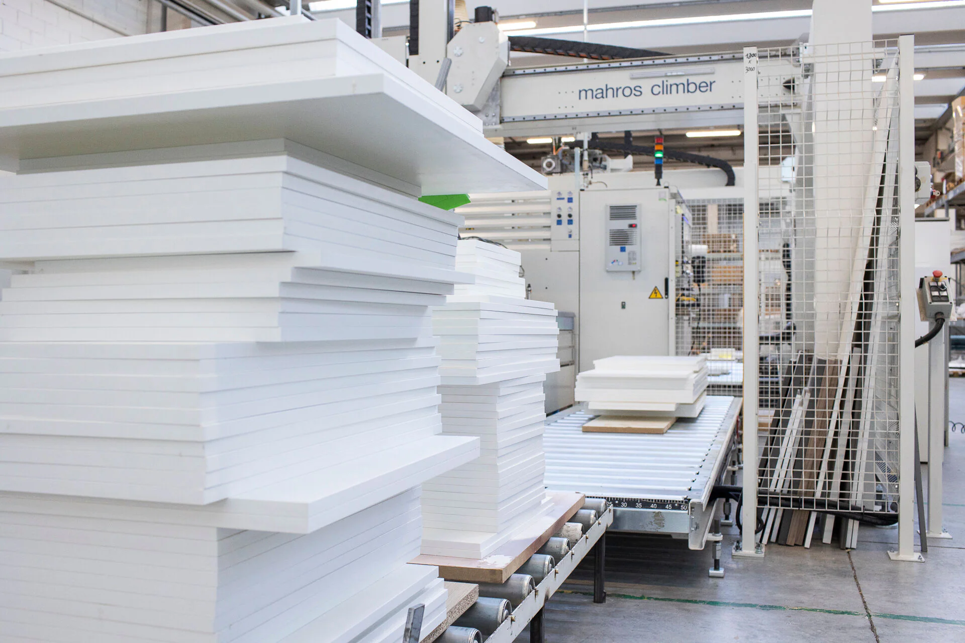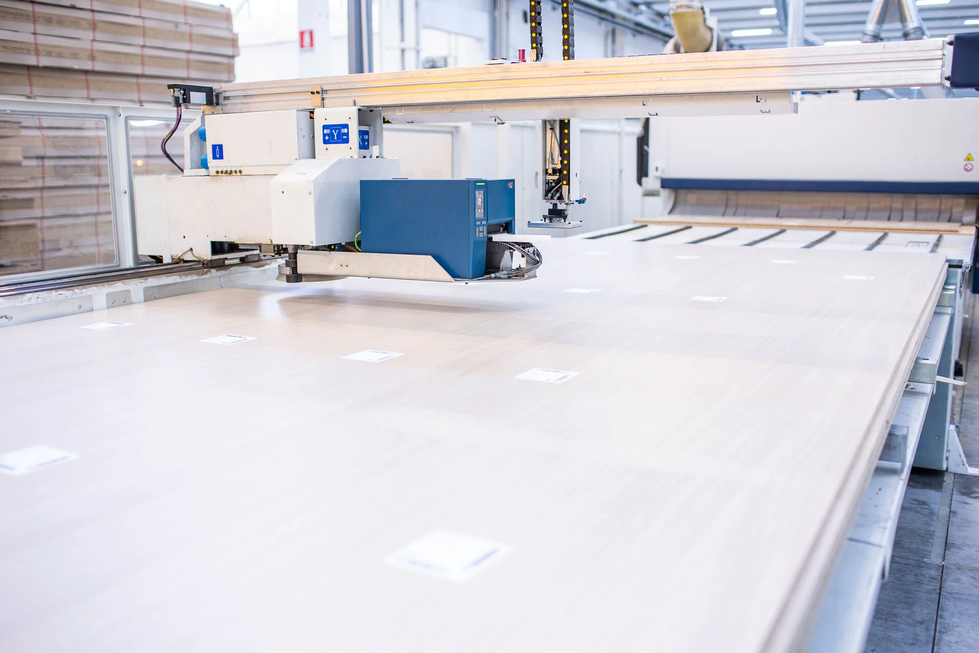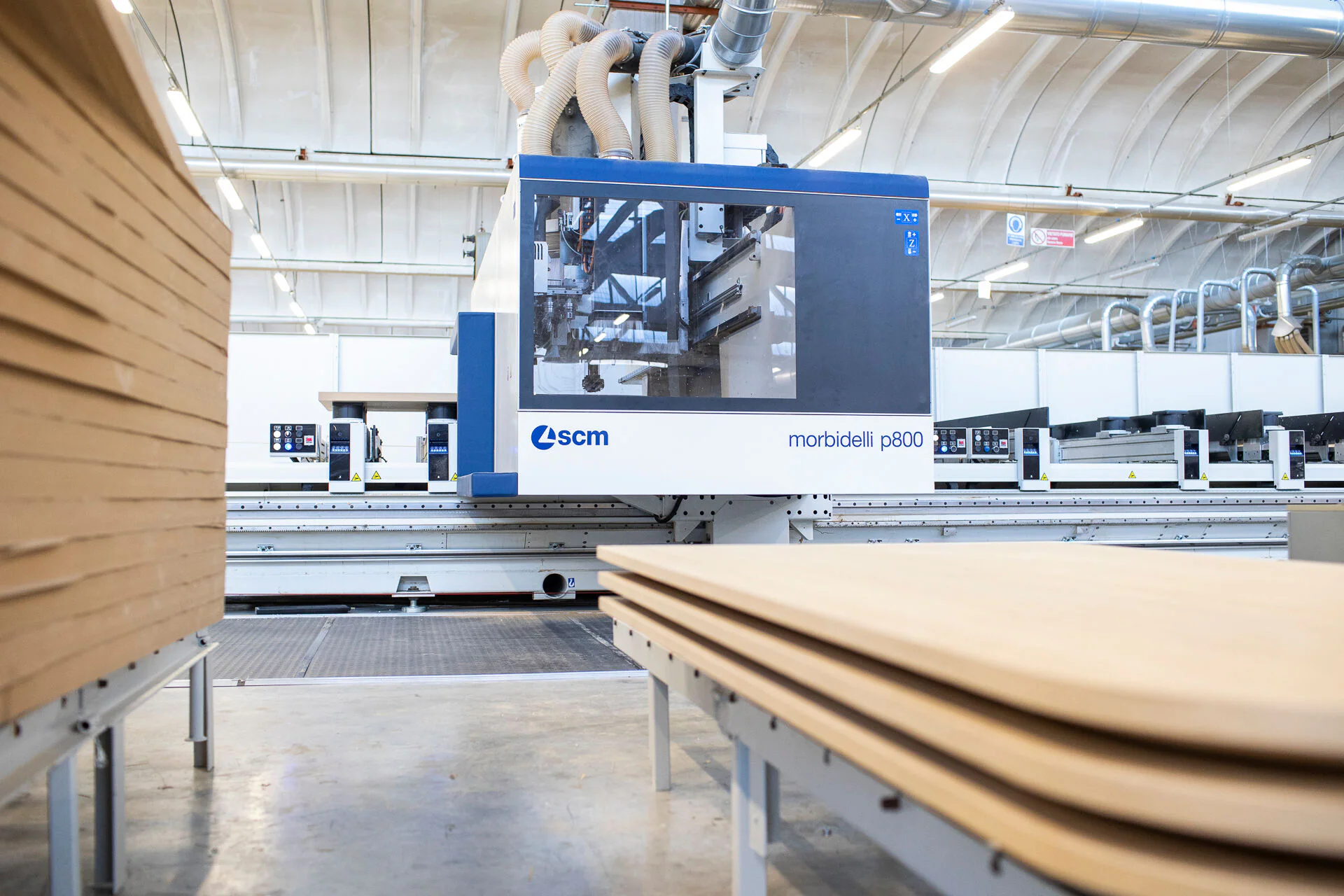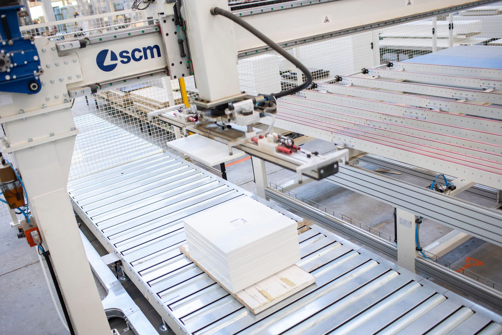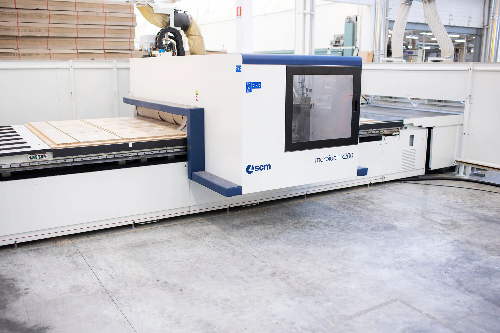 Nello stabilimento di Asiero saltano subito all’occhio gli ultimi acquisti made in SCM. L’intero processo a “lotto 1” parte dalla cella nesting “morbidelli x200” completa di carico automatico integrato con sistema di etichettatura. La velocità di taglio della cella permette una produttività senza precedenti anche per lavorazioni altamente flessibili. “Il nostro obiettivo era di gestire i lotti più piccoli con una maggiore efficienza e con un risultato qualitativo all’altezza delle richieste del mercato” spiega Giancarlo Sola, Operations Manager.