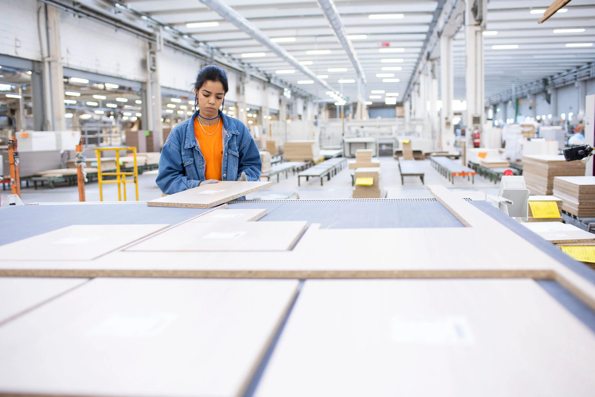 Nell’area di scarico della cella nesting un’operatrice (e non possiamo non notare che le donne in produzione nella fabbrica di Estel sono diverse) effettua un primo riordino dei pezzi in base alle relative commesse.