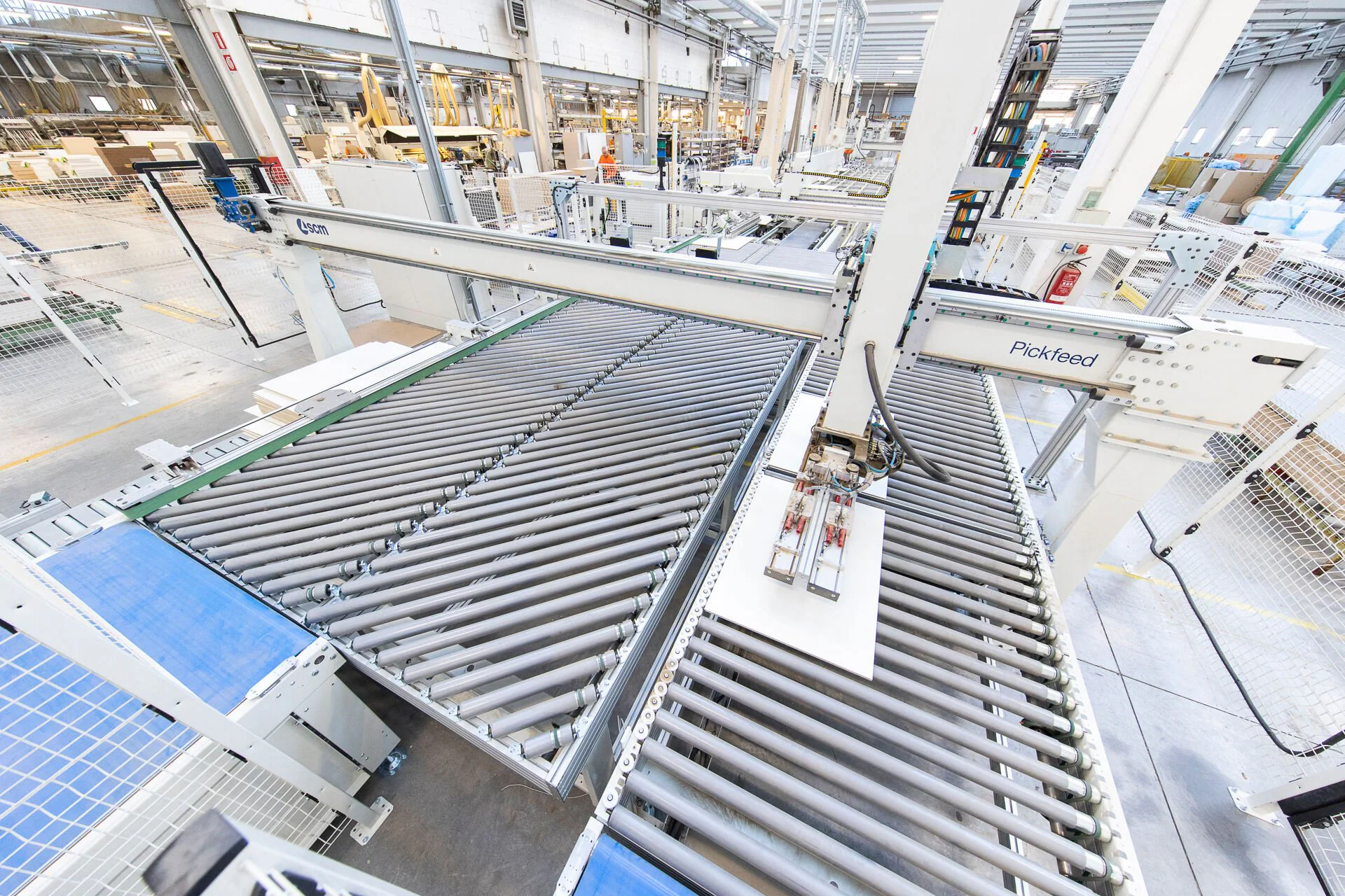 In seguito i pannelli vengono passati alla cella di bordatura “stefani cell H”. Si tratta anche in questo caso di una soluzione molto evoluta, studiata da SCM per una produzione industriale altamente flessibile a “lotto 1”. La cella ha un ponte di carico automatico e ricircolo Pickfeed che semplifica la gestione di pile miste con pezzi diversi l’uno dall’altro e un sistema di ritorno pannelli Pickback completo di scarico automatico.