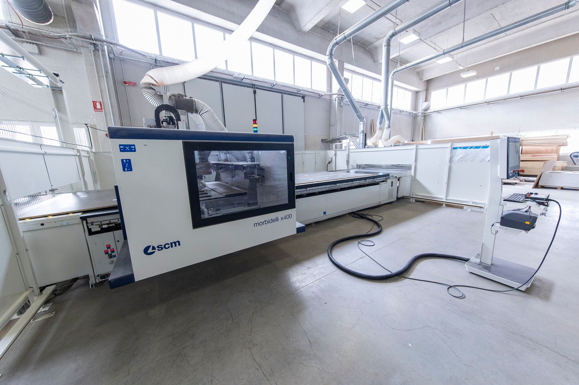 Il centro di lavoro cnc “morbidelli x400” è in versione cella, con un piano di lavoro unico, e possiede un’ampia gamma di utensili per la foratura, la fresatura e il nesting per soddisfare ogni esigenza di lavorazione, anche le più complesse come la realizzazione di incastri nei casi in cui si vuole evitare la colla per favorire lo smontaggio degli arredi per il loro successivo utilizzo.