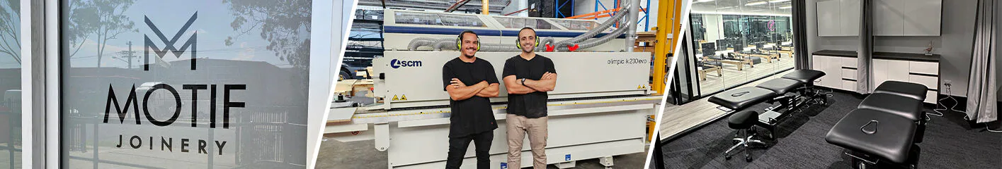 Uno dei fattori chiave del successo di Motif Joinery è l'investimento in macchinari di qualità. Quando è giunto il momento di attrezzare la loro officina, Mena e Michael si sono rivolti a SCM e il gruppo italiano, leader mondiale nelle tecnologie per la lavorazione del legno, è stata lieta di fornire a Motif la combinazione perfetta di soluzioni per soddisfare le loro esigenze produttive. Tra queste spiccano una “nova si 400”, sega circolare versatile e potente, ideale per eseguire una vasta gamma di applicazioni, e la bordatrice “olimpic k230 evo”, efficiente e compatta nelle dimensioni, ma in grado di creare un prodotto finito di alta qualità funzionale ed estetica.
