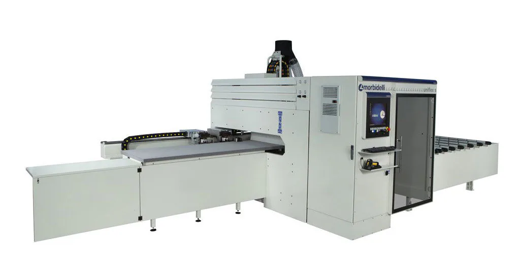 • Morbidelli Uniflex HP,  a work center designed for boring, routing, grooving and dowelling operations that integrates the effectiveness of a boring line with the flexibility of a machining center.  It features both upper and lower machining units that allows for simultaneous machining operations on opposite sides of the panel.