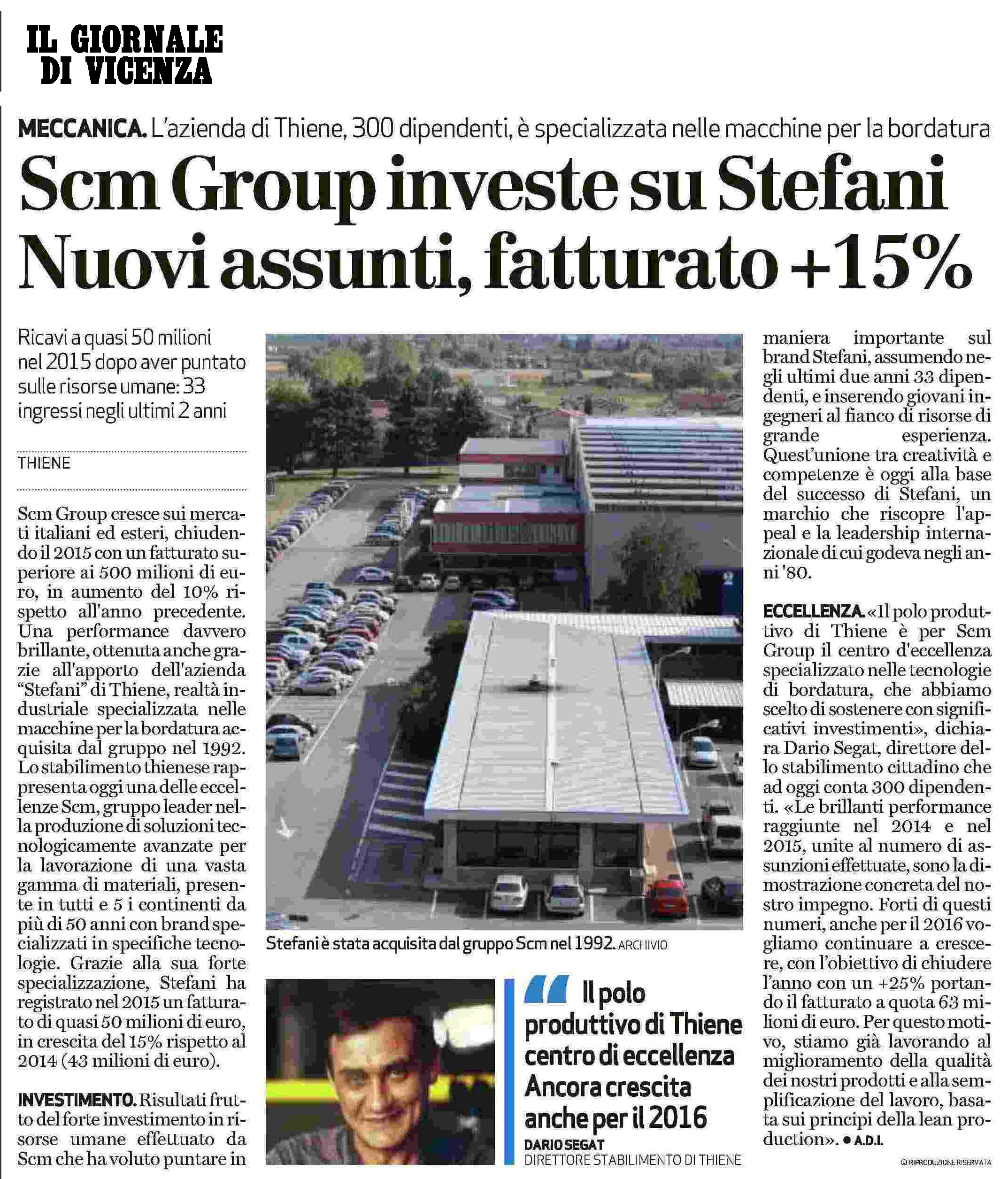 Scm Group investe su Stefani, centro di eccellenza specializzato nelle tecnologie di bordatura. Nuovi assunti e fatturato in crescita del 15%. Articolo de Il Giornale di Vicenza del 18-06-2016.